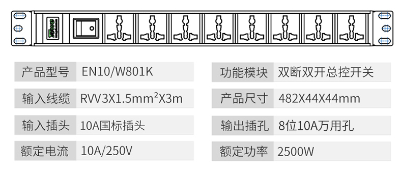 3米線+8位10A多用孔+雙斷雙開帶指示燈總控開關 EN10/W801K